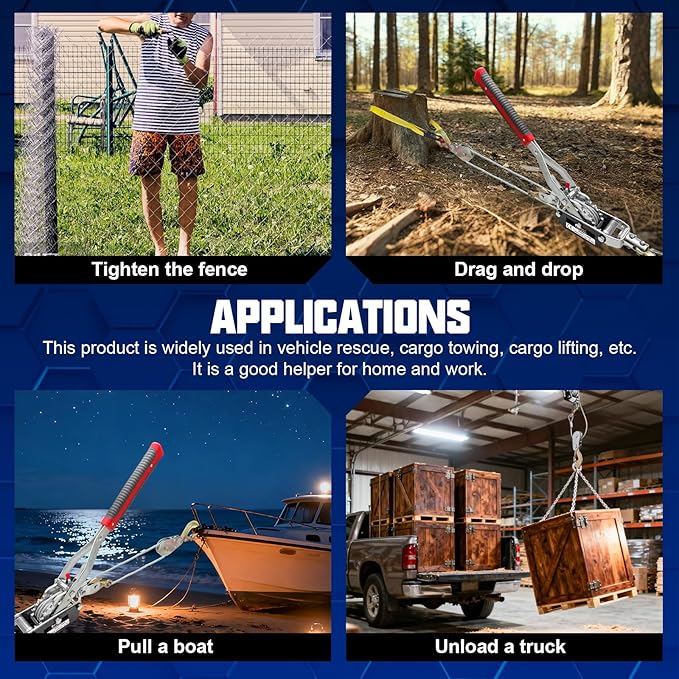 - 【Secure Anti-Slip Design】The come a long hand winch incorporates an anti-reverse mechanism and spring-latched hooks for complete load security. This cable puller system prevents accidental release, giving you peace of mind during critical vehicle recovery operations and heavy lifting tasks.