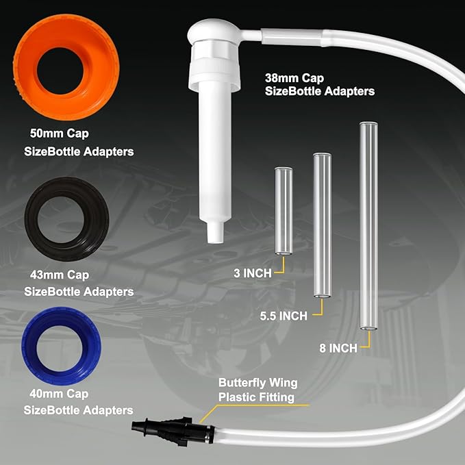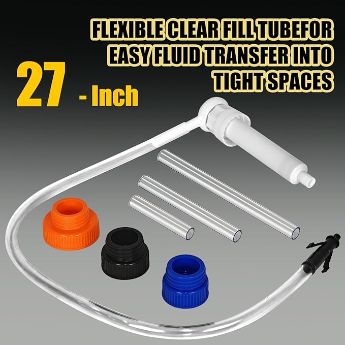 - Flexible and Convenient Tubing - The 20-inch flexible, clear fill tube provides the necessary reach to direct fluid into tight, hard-to-reach areas. Additionally, three suction tubes of varying lengths are included to accommodate bottles of different heights, enhancing versatility