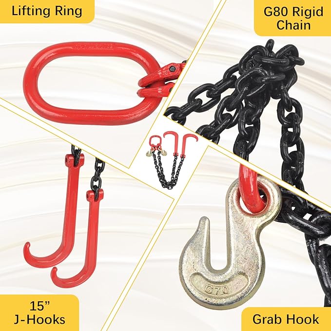 - ADJUSTABLE DESIGN: Chain Length: 3 feet; J-Hook Size: 15 inch; Grab Hooks at the top facilitate leg length adjustment, securely hooking and managing chain slack post-adjustment, accommodating diverse towing requirements