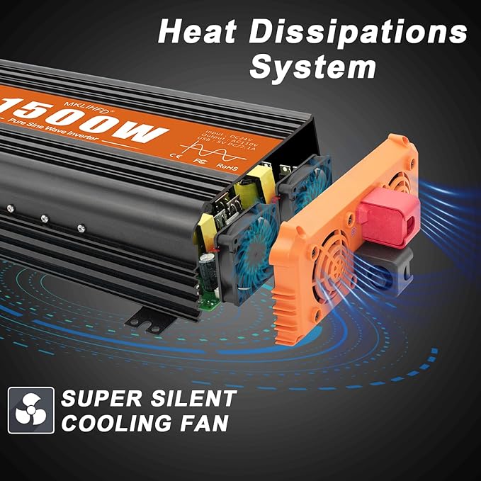 - {Safety protection} This 1500 watt inverter has Multiple protections: overvoltage, undervoltage, overload, short circuit, overheating and soft start technology. Equipped with dual cooling fans, excellent heat dissipation performance. Ensure your safety during use and extend the service life of the inverter.