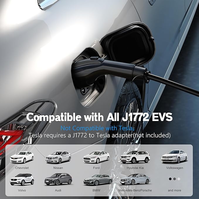- 【Compatible EV Models】This EV charger is compatible with most J1772-equipped major electric vehicles, including models from Ford, Chevrolet, Hyundai, Audi, Nissan (such as the Ariya), Rivian (like the R1S), Kia, and others.Please note that it is not compatible with the Mini Cooper Electric Hardtop, Toyota models (including the Prius Prime, bZ4X, and RAV4 Prime), Porsche Taycan series (Base/4S/Turbo/Turbo S), or Tesla vehicles. For Tesla models, a separate J1772 to Tesla adapter is required