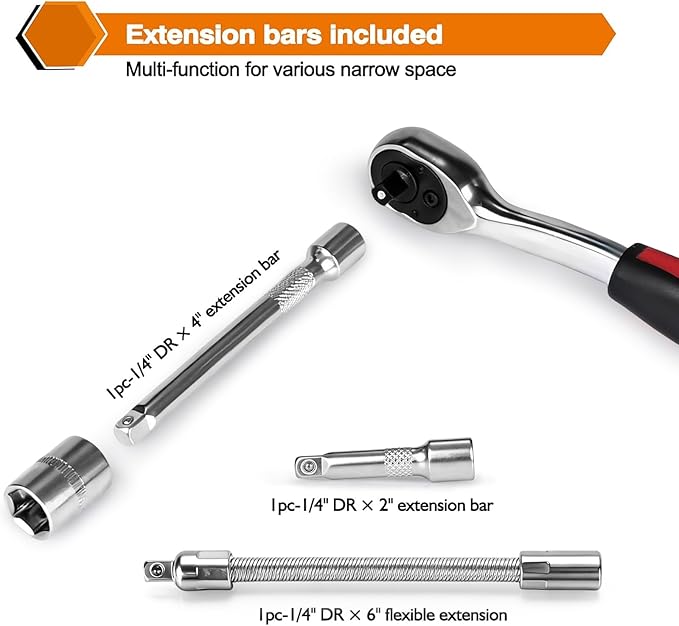 - Multi extension bars: This ratchet wrenches set included multi extension bars is suitable for various scenarios: 1pc 1/4"dr universal joint, 1pc 1/4"dr × 2" extension bar, 1pc 1/4"dr × 4" extension bar, 1pc 1/4"dr × 6" flexible extension, 1pc 1/4"dr sliding t-bar, 1pc 1/4"dr sliding t-bar, 1pc 6" spinner handle and 1pc-bit adapter.