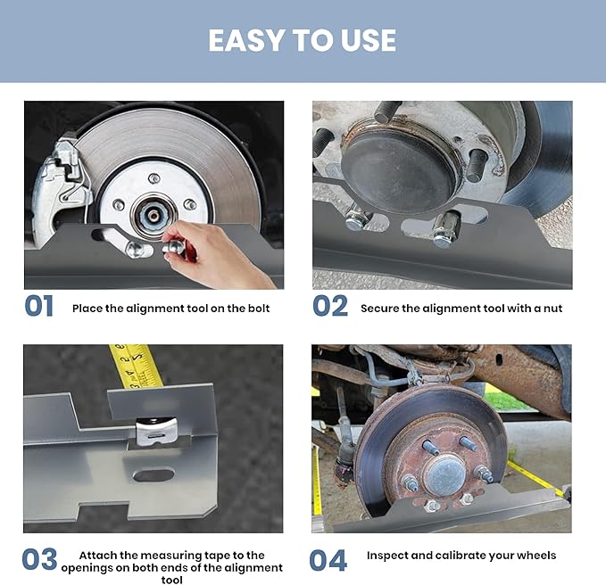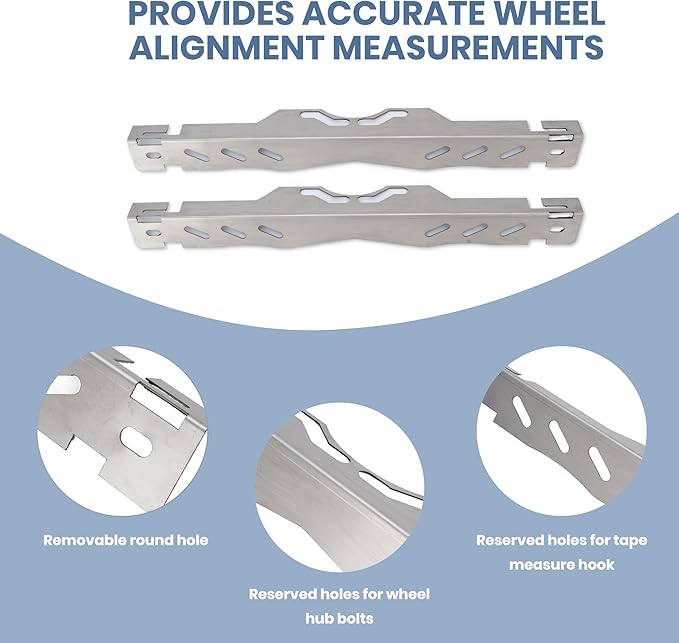 - SIMPLE OPERATION:After removing the tire, install the wheel alignment tool onto the hub to streamline the centering process and enjoy effortless convenience. Quickly identify vehicle issues while precisely calibrating wheel alignment. (Tape measure not included)