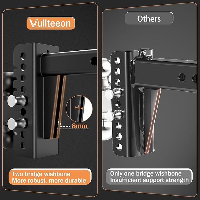 - 【8-Inch Drop Hitch Fits 2-Inch Receiver Only】This Vullteeon Adjustable trailer hitch fit 2 inch receiver effortlessly fits most Class IIV,IV vehicles,including heavy Trucks, RVs, Farm Trailers, Cargo Trailer, Livestock trailer, Campers and even off-road vehicles like ATVs and motorcycles