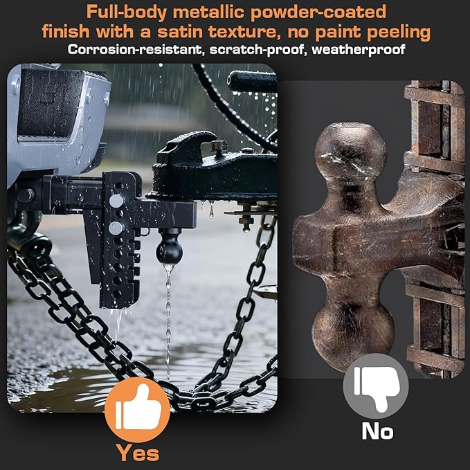 - 【8 mm Thickened Steel for One-Handed Installation】Our drop hitch is constructed from heavy-duty composite steel with a double-ribbed reinforced structure, featuring 8mm thick forged components and precision welding. Equipped with an anti-theft pin and finished with a rust-resistant, waterproof matte coating for lasting durability. The ball socket and shaft groove fit perfectly, enabling one-handed installation. An 8-inch height adjustment range accommodates various vehicles, ensuring smooth towing