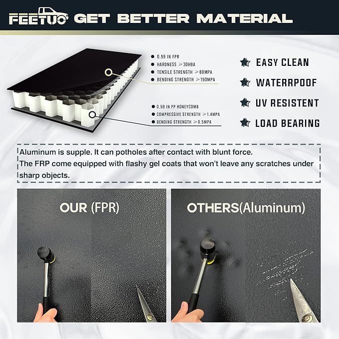 - Multiple Protection: Effectively shields the truck bed and valuable cargo from rain snow dust and UV rays keeping tools camping gear sports equipment luggage and fishing supplies safe and dry Reduces wind drag while driving which helps improve fuel economy and ensures quieter smoother highway performance FeeTUO cover is not only a functional upgrade but also a stylish addition to your truck making it a thoughtful and practical gift for family friends or yourself