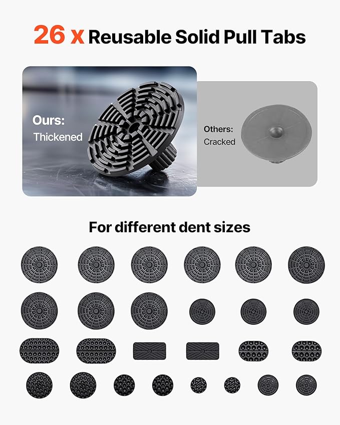 - Works on Various Dents: This paintless dent removal kit comes with multiple sizes of pull tabs, handling tiny hail dents and medium-sized collision dents. The solid rubber tabs are tough and reusable, and grip tightly without damaging your paint
