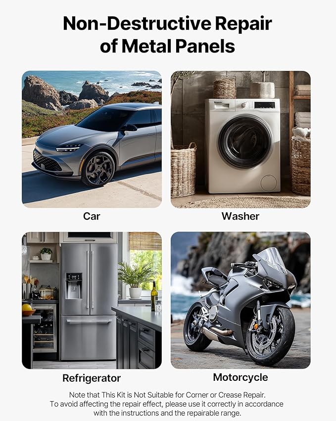 - Multi-Purpose Repair Tool: This dent pulling kit isn't just for cars—it also works on metal surfaces like refrigerators, washing machines, and more. Note: Not recommended for vehicles that have been repainted or had prior bodywork