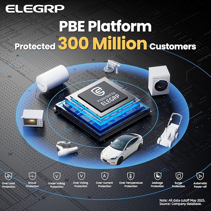 - 【Reliable Safety with PBE & LCR Tech】Powered by ELEGRP's exclusive PBE technology, this charger offers full protection against surges, leakage, and overloads—trusted by over 100 million households since 2000. The J1772 charger uses LCR tech ensures better conductivity, cooler charging, and stable speed.