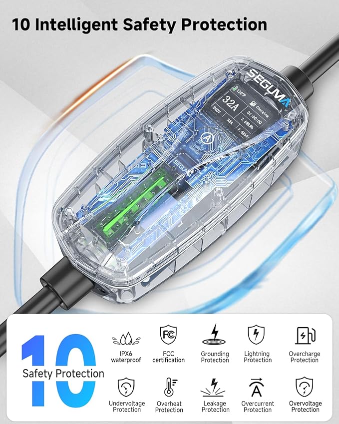 - Safe and Reliable: Feature with built-in advanced chipset, Seguma level 2 charger provides multi-layered protection against leakage, grounding issues, overvoltage/undervoltage, overcurrent, overcharging, overheating and short circuit protection. With an IP66 waterproof rating and -22°F to +122°F working temperature range, the ev charger will withstand various charging environments including the diverse extreme weather conditions of the US. Additionally, the IP66 home ev charger level 2 automatically shuts off once your vehicle is fully charged, enhancing car safety