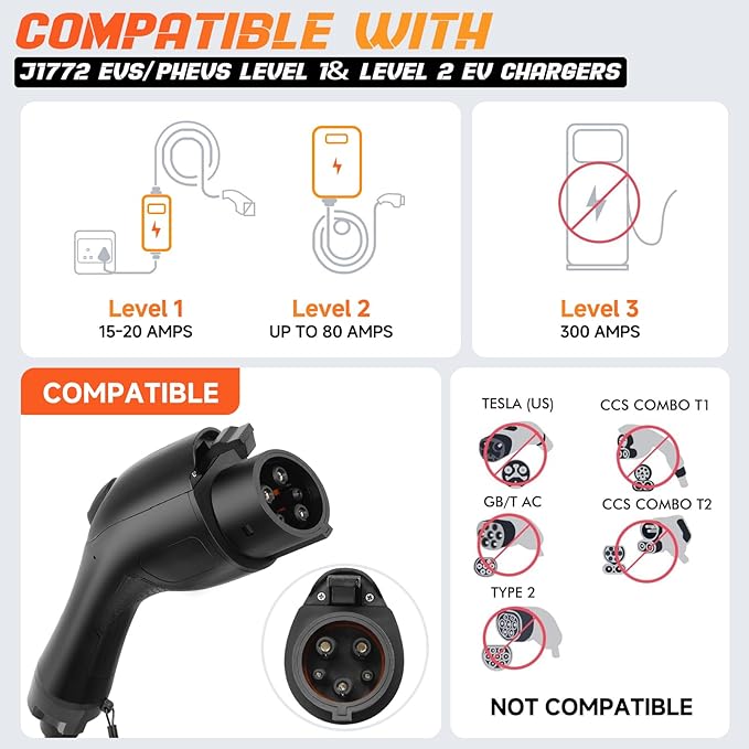 - 【Important Note】 Specifically designed for J1772-equipped vehicles, while Tesla vehicles require a separate J1772 adapter (not included). Please fully unroll the cable before use and do not coil the power cable during operation to prevent overheating