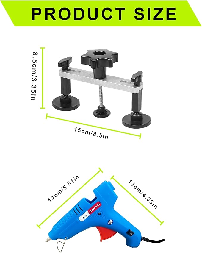 - 【22PCS Dent Repair Kit】This car dent removal kit with bridge puller can deal with medium sized dents.dent removal tool including a high-tack 100w hot glue gun and 5pcs glue sticks provide a specialised solution for large, medium, small and irregular dents.