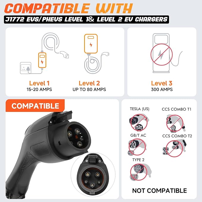 - 【Important Note】 Specifically designed for J1772-equipped vehicles, while Tesla vehicles require a separate J1772 adapter (not included). Please fully unroll the cable before use and do not coil the power cable during operation to prevent overheating