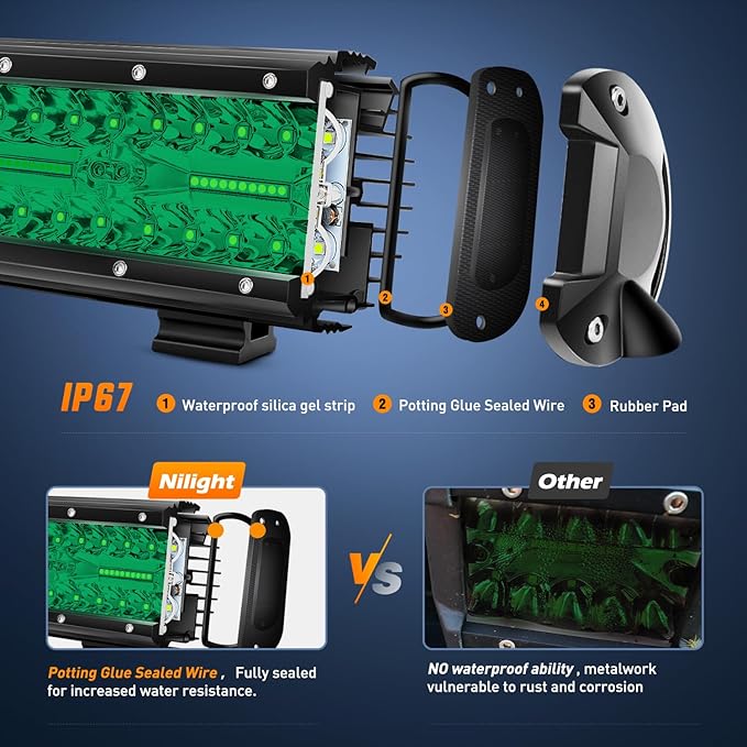 - Green Super Bright Combo Beam: Adopted 40pcs 3w chips, appropriate combination of spot beam and flood beam for wide spread and further distance illumination, allowing you to see the front and rear cars clearly in bad weather such as night or heavy fog, light up your night fishing, night ride or any other night activities