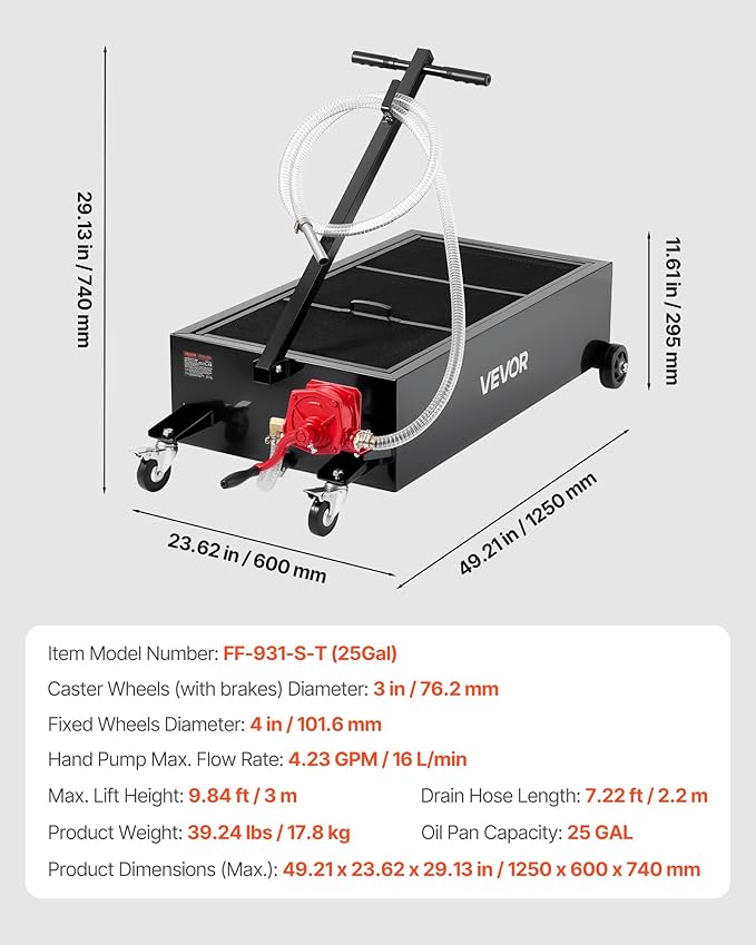 - Efficient Oil Draining: This low profile oil drain pan comes with a hand pump, no power needed! Its solid build makes it reliable in outdoor or no-electricity settings like farms or service trucks, giving you full control every time