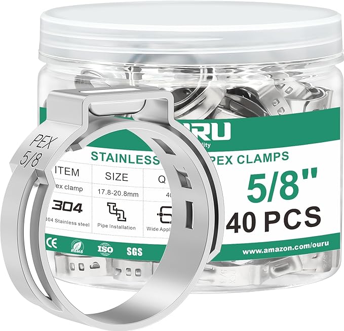 - OURU Pex Clamps: These pinch clamps include 40pcs 5/8 inch(17.8-20.8mm) pex ear clamps, which are stored in a bottle for easy storage and portability. These pex fitting clamps are designed for use with pex tubing and can be easily installed and disassembly for daily applications