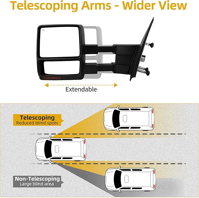 - Manual Telescoping & Folding Design – Easily extend mirrors to see around for lane changes, overtaking, or parking, and fold them in when not in use to save space and avoid damage in tight areas.