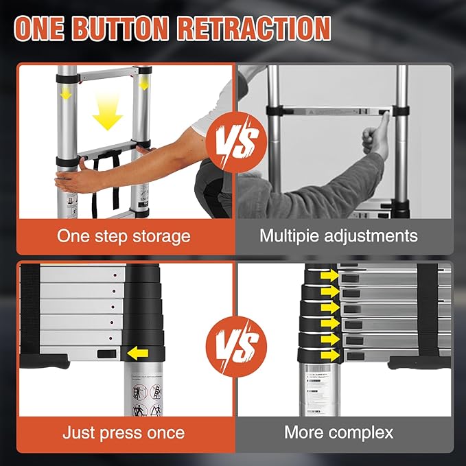 - One-Button Slow-Close Retraction System: Our telescoping ladder features an intuitive one-button retraction mechanism. The bottom section is equipped with a slow-release mechanism; press the button, and it descends slowly and steadily first, followed by the quick, smooth retraction of the remaining sections, allowing for safe and effortless setup and storage in seconds. (Caution: Mind your hands during retraction to prevent pinching.)