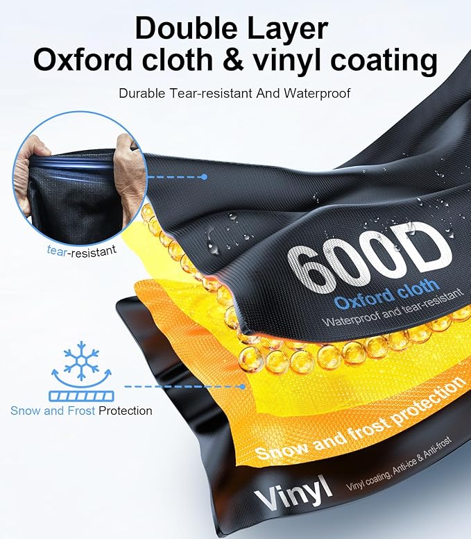 - [Against Frost, Ice & Snow] This Windshield Cover For Ice and Snow Constructed with 600D Oxford fabric + waterproof black Vinyl layer, blocking snow, frost, and moisture from the air. The Oxford fabric prevents tearing while the Vinyl coating resists water and low-temperature cracking. Whether it’s heavy snow or dry frost, your windshield stays spotless and clear — saving you from early-morning scraping in the cold.