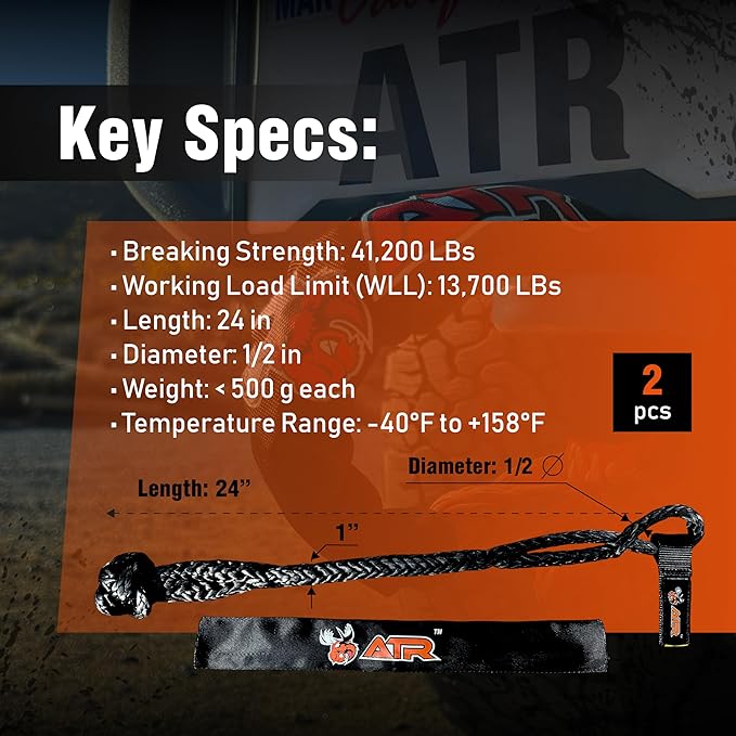 - πͺ Unbreakable Strength β Rated at 41,200 lbs, made from premium UHMWPE synthetic rope. Stronger than steel shackles yet ultra-lightweight. Designed for off-road recovery, towing, and winching with maximum safety.