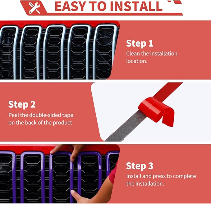 - 【EASY INSTALLATION】With double-sided tape, the car front head lamp overlay and front center clip-on grille inserts kit can be easily placed on the right place without any tools, no damage to the car. Double-sided adhesive has strong adhesion, car washing, raining, wind, not afraid of falling.Don't worry, we have attached installation pictures. If you have any installation problems, please contact us.