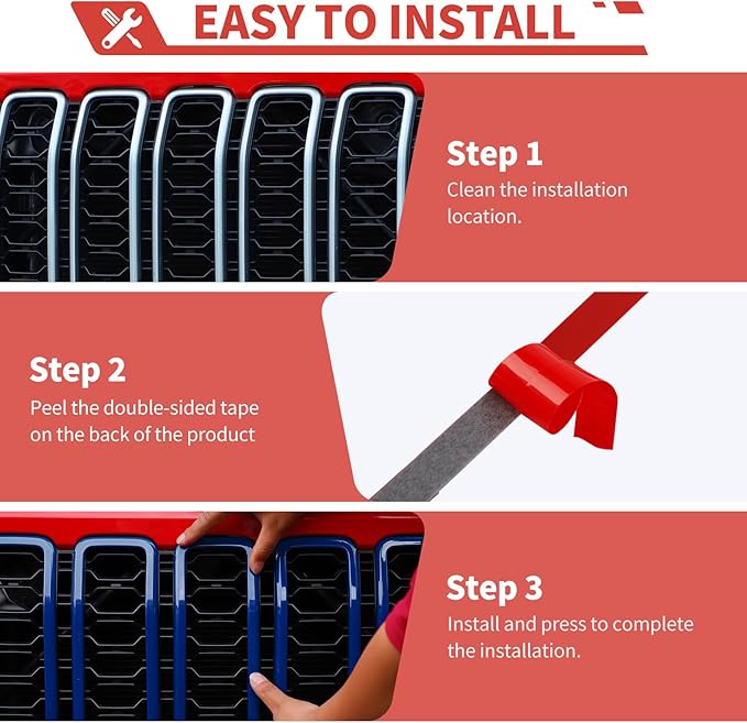 - 【EASY INSTALLATION】With double-sided tape, the car front head lamp overlay and front center inserts meshes kit can be easily placed on the right place without any tools, no damage to the car. Double-sided adhesive has strong adhesion, car washing, raining, wind, not afraid of falling.Don't worry, we have attached installation pictures. If you have any installation problems, please contact us.