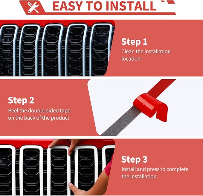 - 【EASY INSTALLATION】With double-sided tape, the car front head lamp overlay and front center inserts meshes kit can be easily placed on the right place without any tools, no damage to the car. Double-sided adhesive has strong adhesion, car washing, raining, wind, not afraid of falling.Don't worry, we have attached installation pictures. If you have any installation problems, please contact us.