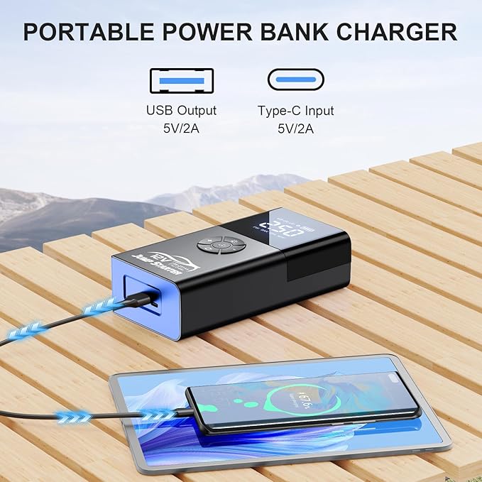 - 【Portable Backup Power Bank Supply】 Jump box air compressor can be used as a battery pack charger portable. Integrated 4 thinner, high-capacity battery packs, the battery jumper starter portable also works as a long-lasting power bank recharging any personal mobile device, like smartphones, tablets, or other USB devices.