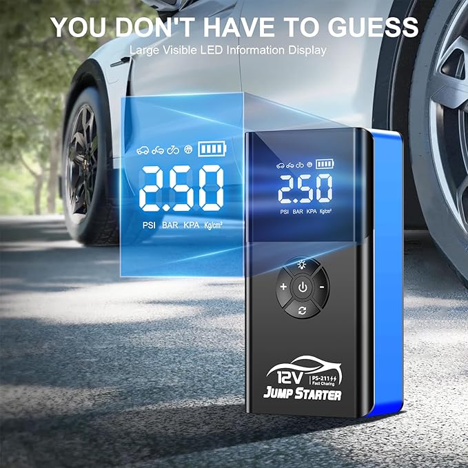 - 【MORE THAN A JUMP STARTER】jump starter is derived from the upgraded design of 2025 which will lead the market trend in the future. This battery jump starter integrates six functions such as car emergency start, tire inflator, lighting, SOS warning, charging for mobile devices, and starting 12V vehicle-mounted devices.