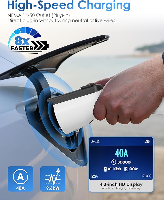 - [Plug & Charge & 4.3-inch HD Display for Full Control ]– Maximum convenience: Simply plug in and charge – no complicated settings required! Ideal for stress-free charging at home. The 4.3-inch HD display shows real-time charging status, voltage, current, and temperature, so you always stay informed. Whether at breakfast or after work – just one glance to know when your car is ready to go!