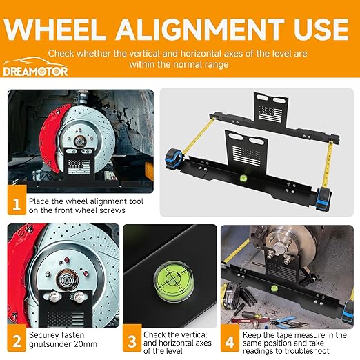 - ๐๐ข๐ฆ๐ฉ๐ฅ๐ข๐๐ข๐๐ ๐๐จ๐ฆ๐ ๐๐๐๐ฌ๐ฎ๐ซ๐๐ฆ๐๐ง๐ญ - This comprehensive at home wheel alignment kit wheel alignment tool kit measuring wheel includes 2 alignment plates, 2 measuring tapes, 2 levels, and a wrench for straightforward setup and reading. The integrated non-slip slots securely hold the tapes in place, preventing slippage to ensure accurate and reliable measurements every time.
