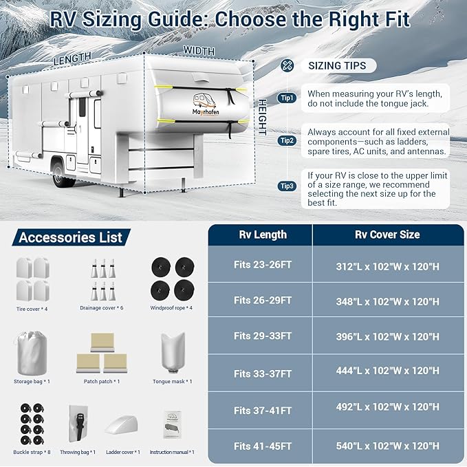 - 【All-Season Protection You Can Trust】From scorching summer heat to icy winter mornings, this fifth wheel RV cover provides reliable defense against rain, snow, tree sap, and dust. It keeps your trailer exterior clean, dry, and scratch-free, helping extend the life and value of your RV year after year.
