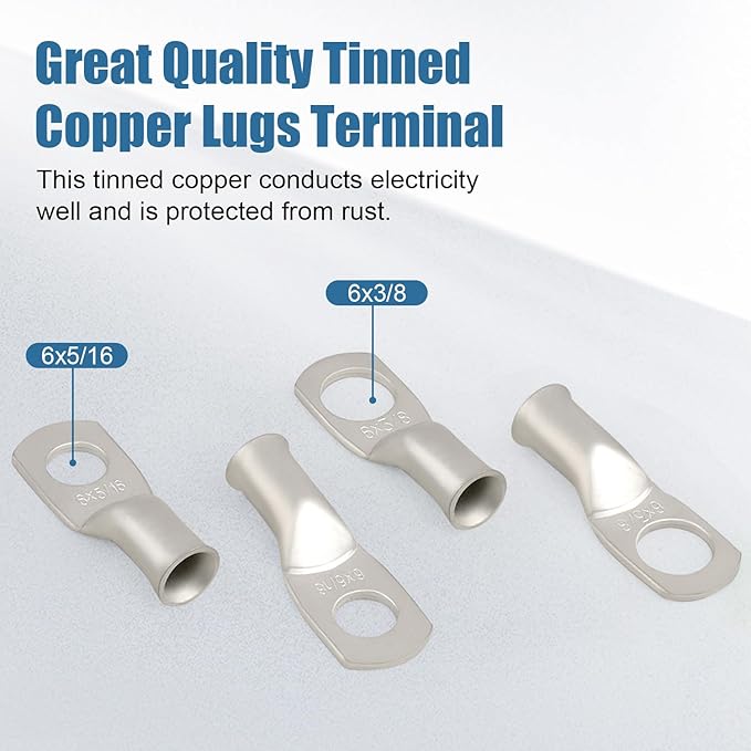 - 5/16" & 3/8" Battery Cable Lugs -- Crafted from tinned, high-purity copper for superior corrosion resistance in harsh environments like marine and outdoor use. The sealed end design shields the cable connection from the elements, while the flared entry simplifies wire insertion. These lugs ensure excellent electrical conductivity and offer a secure, reliable termination whether you choose to crimp or solder.