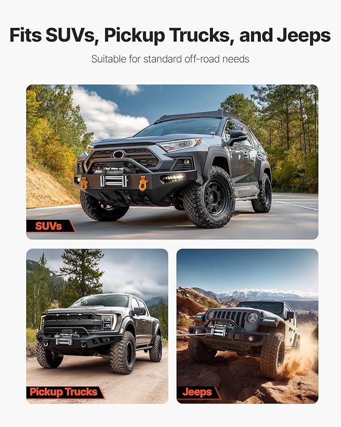 - Wide Compatibility: The universal mounting pattern fits most SUVs, pickups, and Jeeps. The recovery winch set includes fairlead, hook, and power cables—ready for fast setup and use.