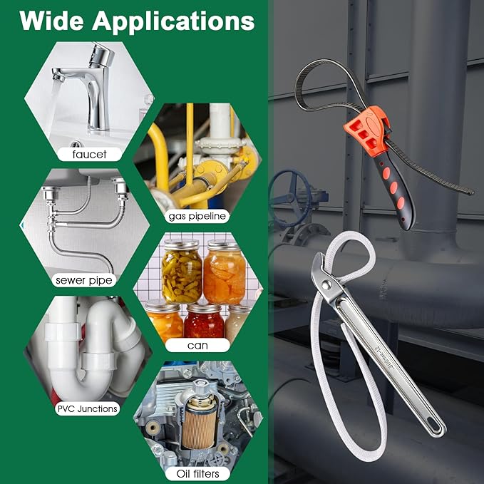 - ✅QUICK-ADJUST & USER-FRIENDLY DESIGN--The 12-inch oil filter wrench offers a smooth, infinite adjustment mechanism for a perfect fit on 2 to 6-inch diameters; The 6-inch strap wrench plumbing provides flexible sizing from 1 to 3 inches with its elastic rubber belt, making every task simple and efficient.