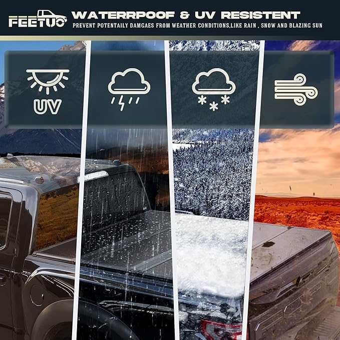 - Patent Design: FeeTUO Tri Fold Truck Bed Cover features a unique quick release clamping system allowing the cover to fold easily into thirds at the hinges Perfect for loading taller items such as ladders or building materials while maintaining a secure fit
