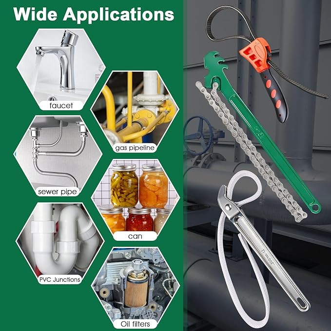 - ✅ VERSATILE FOR PROFESSIONALS & DIYers--The ultimate multi-purpose adjustable wrench set for a wide range of applications: removing car oil filters, loosening plumbing pipes, opening stubborn jars, or working on lawnmower filters. A must-have strap wrench tool kit for professional mechanics, plumbers, and home garage enthusiasts alike.