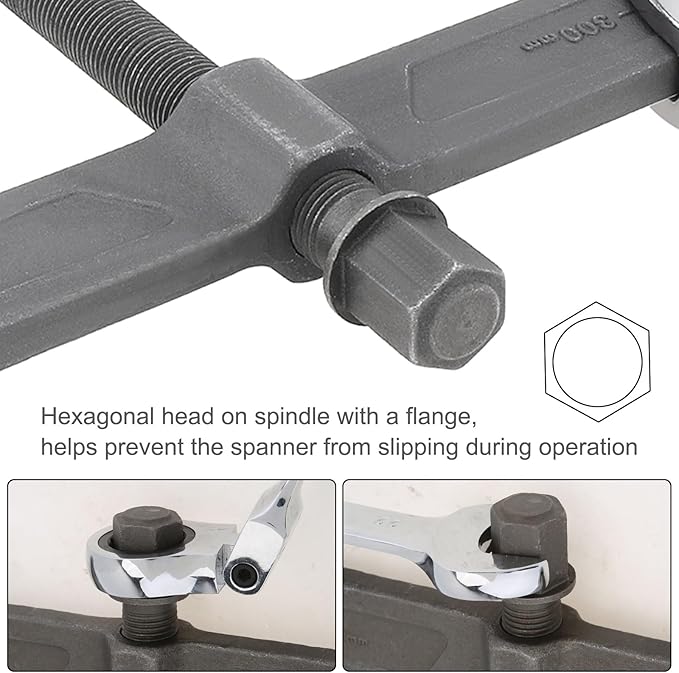 - Ease of Use - Hexagonal head on spindle with a flange, helps prevent the spanner from slipping during operation. Button on beam enhances the stability and safety, also makes the 2-jaw separator tool easily to change the puller into internal or external gear puller.