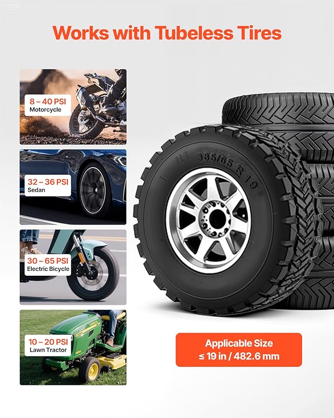 - Tire Compatibility: 1.6 Gal / 6 L cylinder, fits tubeless tires ≤ 19 in / 482.6 mm. Operating pressure: 87–116 PSI / 0.6–0.8 MPa. Suitable for cars, motorcycles, SUVs, pickups, lawn tractors, and travel trailers