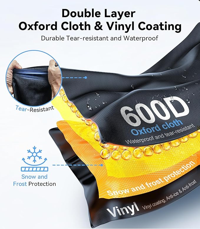 - [Against Frost, Ice & Snow] This Windshield Cover For Ice and Snow Constructed with 600D Oxford fabric + waterproof black Vinyl layer, blocking snow, frost, and moisture from the air. The Oxford fabric prevents tearing while the Vinyl coating resists water and low-temperature cracking. Whether it’s heavy snow or dry frost, your windshield stays spotless and clear — saving you from early-morning scraping in the cold.
