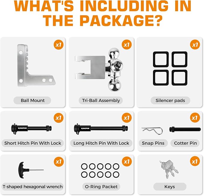- TRI BALL DESIGN WITH 6" DROP/RISE FLEXIBILITY: Kingfun Drop hitch features tri ball hitch, 2 inch ball hitch 8000lbs GTW, 1 7/8 ball hitch 3500lbs GTW, 2 5/16 ball hitch 18500lbs GTW .adjustable hitch mount enables 6 inches of drop or rise adjustment. Easily switch between trailer types while maintaining a perfectly level towing position making it a versatile choice for all your towing needs