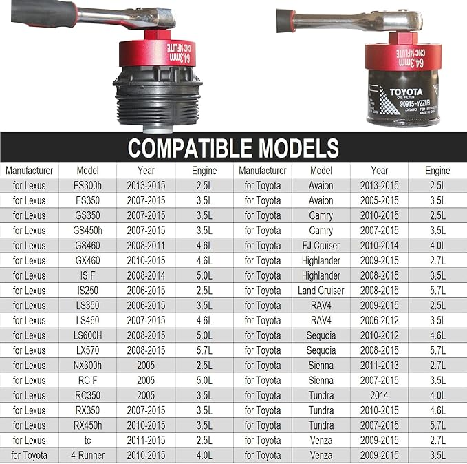 - Oil Filter Wrench, for all Toyota and Lexus cartridge style oil filter caps from 1.8L - 5.7L engines, includes Camry Tundra, Tacoma, 4Runner, RAV4 Corolla Highlander Prius more that use a cartridge style filter where you remove a plastic cap to expose the paper filter element inside. this socket is 64.3mm 14 Flute, 3/8 drive, oil filter caps Removal Tool