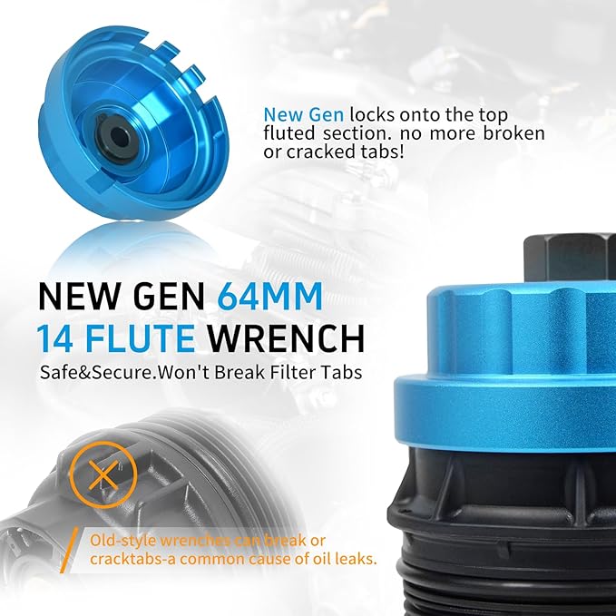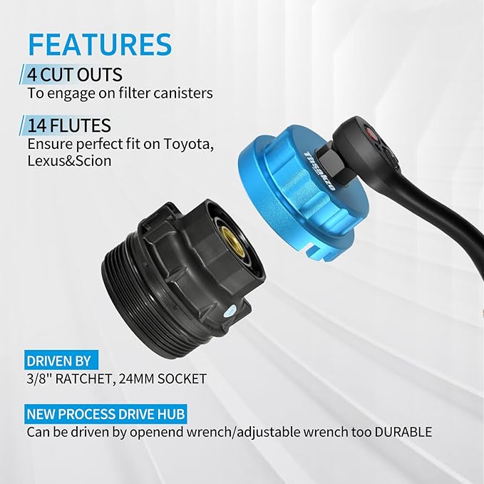 - 【Dimension Parameters】oil filter tool is sized at 64mm with 14 flutes. There are 4slots on the bottom edge to prevent slippage while loosening the oil filter housing. It's applied to 27mm spanners or 3/8" ratchet drive.for easy access and high torque application, making oil filter service quicker and more efficient.