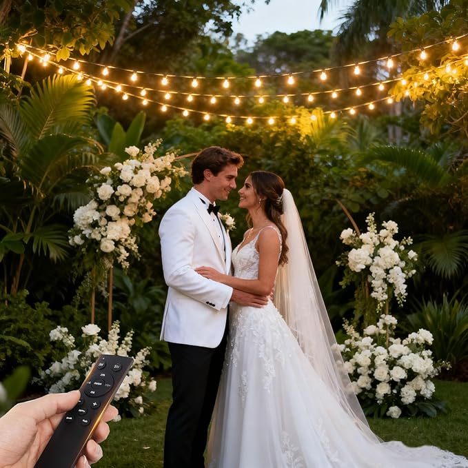 - Remote Control & Dimmable:Reemeer Outdoor String Lights come with remote controls that allow you to adjust the brightness to your needs: 25%, 50%, 75%, and 100%. You can also choose from three lighting modes: Lighting/Breath/Flash, 3 and 5 hour timer modes.