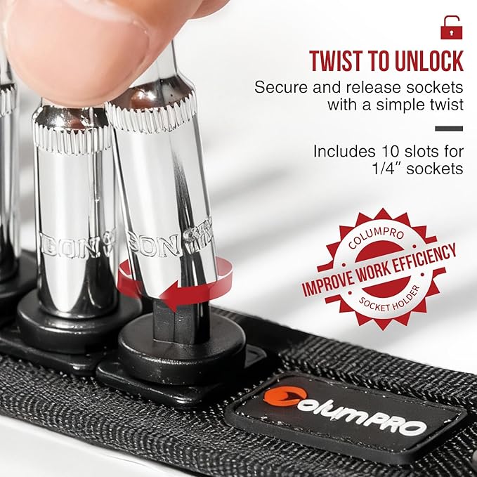 - 【COMPLETE SOCKET HOLDER SET】 The ColumPRO 1/4” Drive Socket Holder Set includes 10 metric sockets (4-13mm) and 10 matching holders with a convenient carabiner for easy transport. Keep your tools neatly organized and always ready for use.