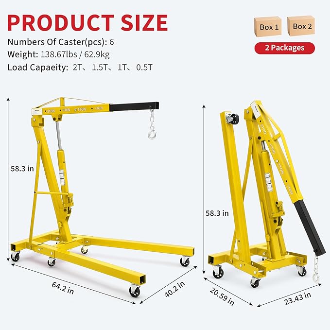 - 1. Unmatched Strength & Durability:Crafted from heavy-duty steel with a 4400 lb (2-ton) lifting capacity, this engine hoist delivers industrial-grade strength. The reinforced frame and anti-rust powder coating ensure stability and long-term reliability, even in harsh workshop conditions.