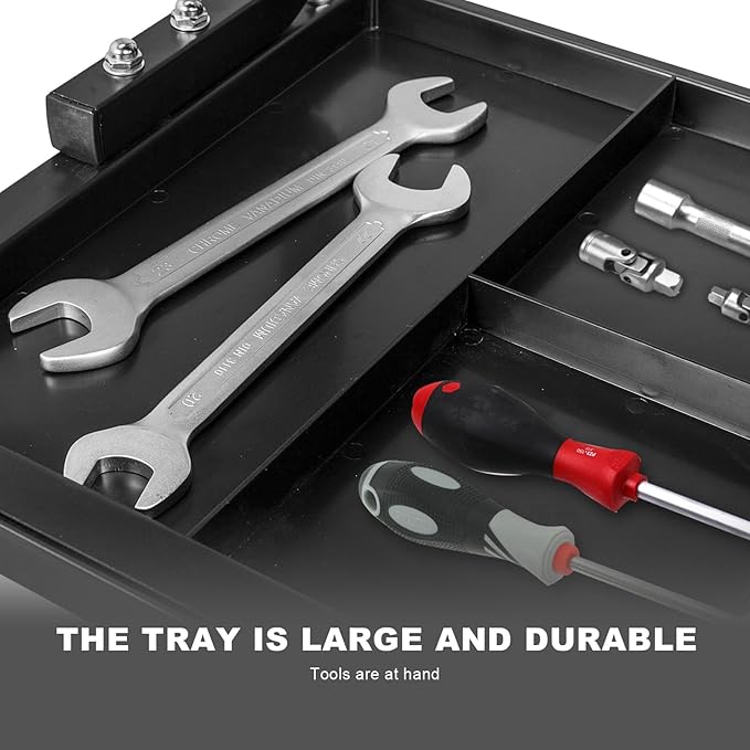 - 3-Zone Tool Tray: Segmented storage with deep compartments fits wrenches, screws, and fluids. Mounted under the seat for quick access—save your time versus running back to your toolbox.