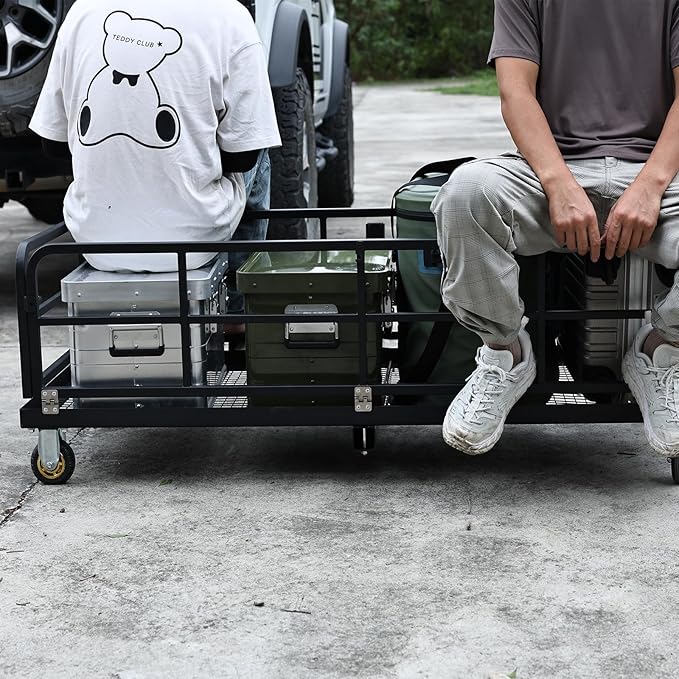 - 2-in-1 Foldable Luggage Basket: Easily convert this folding hitch cargo carrier from a trailer rack to a push cart in minutes without tools. The built-in handle and wheels improve maneuverability, making loading and unloading effortless