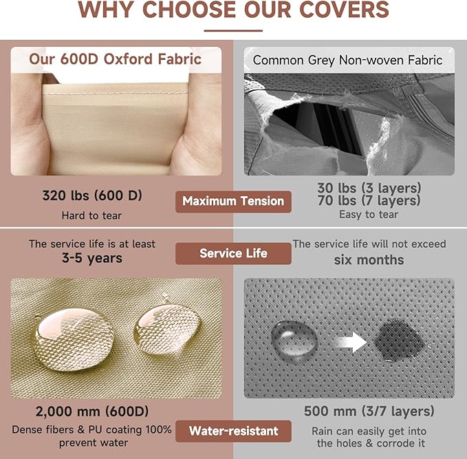 - 【Oxford Fabric vs Non-Woven Fabric】Unlike ordinary non-woven fabric RV covers, Vinpatio brand chooses the superior quality heavy-duty 300D Oxford fabric as the material. In comparison, our 300D Oxford fabric offers a maximum tension of 320 pounds, surpassing the 70 pounds of 7-layer non-woven fabric. With our Oxford fabric RV cover, you'll experience superior tension and tear resistance.Our Oxford fabric RV cover has a lifespan at least 2-4 times longer than non-woven fabric covers.