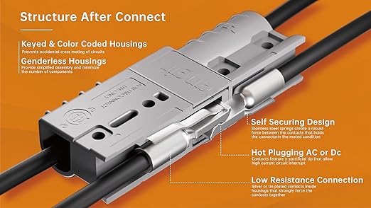 - WIRE CONNECTOR PACK: This handy electrical wire connection set includes 4 clearly marked plugs that let you patch and disconnect 6 to 12 gauge (0.08"-0.16") wire pathways from 12V, 24V, or 36V batteries, supporting currents up to 50 amps